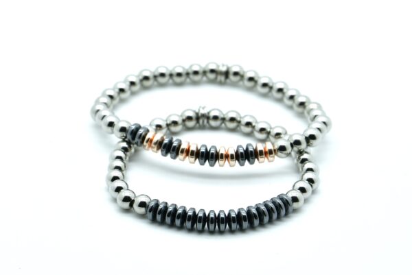 Bracciale con sfere di Ø 6 mm, in acciaio elasticizzato, con inserti in pietra, Ematite e in acciaio rosato, fatto su misura in base al vostro polso, inviare nelle note vostra circonferenza.
