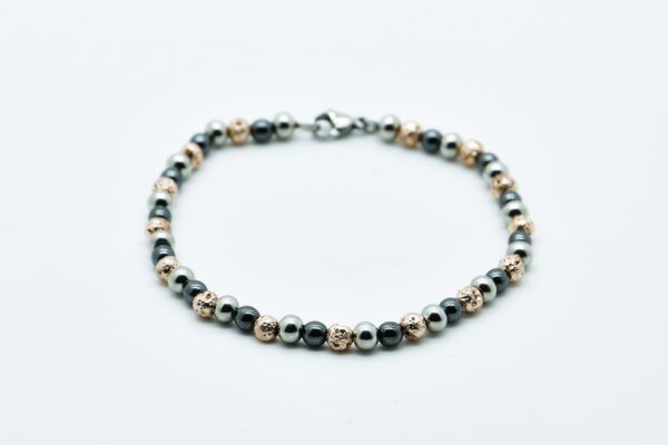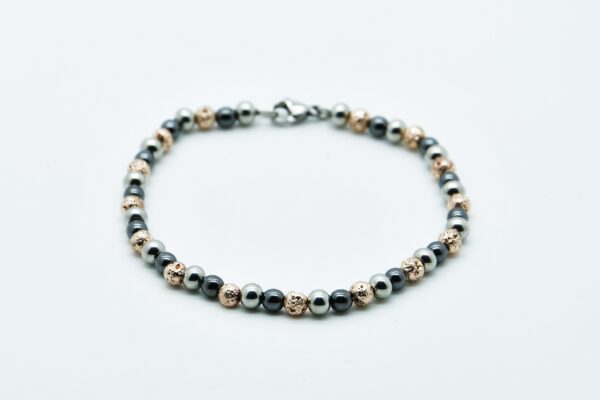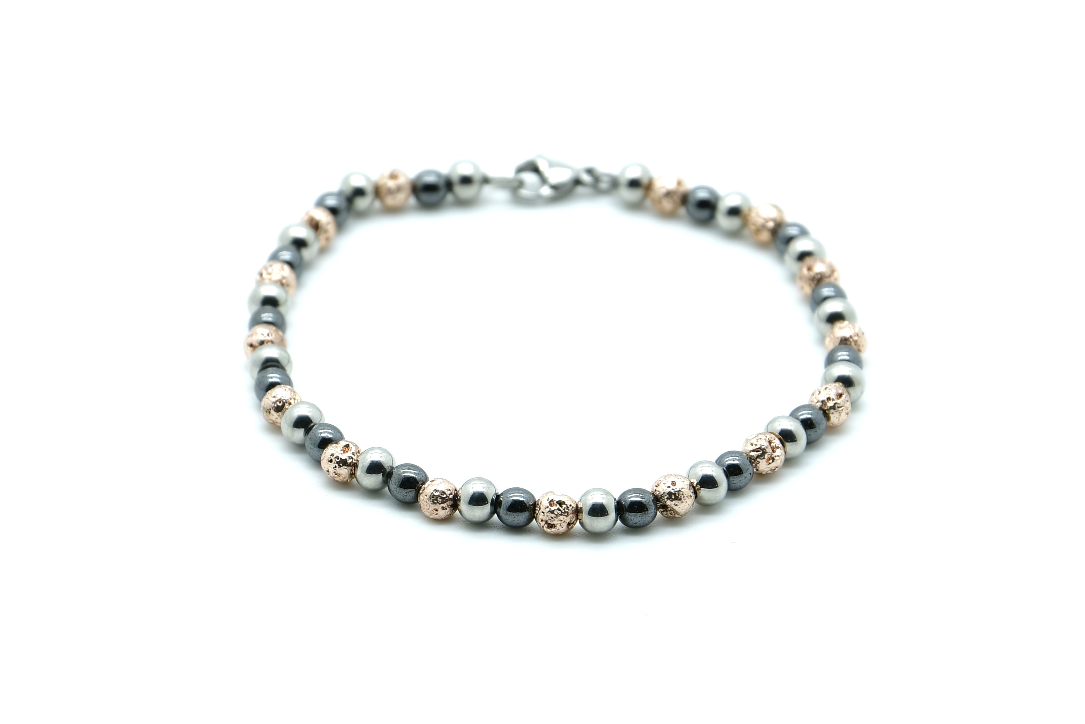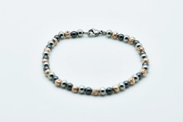 Bracciale con palline miste in acciaio e moschettone come chiusura. Lunghezza 20 cm . Possibilità di averlo personalizzato, scrivendo nelle note misura del polso.